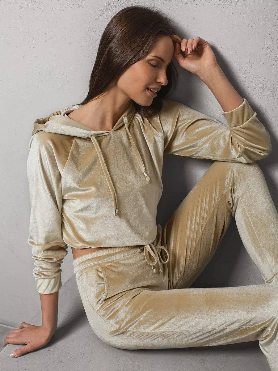 Sieviešu kostīms ir piemērots ne tikai treniņiem, bet arī aktīvai atpūtai. Komplektā ietilpst bikses un džemperis.