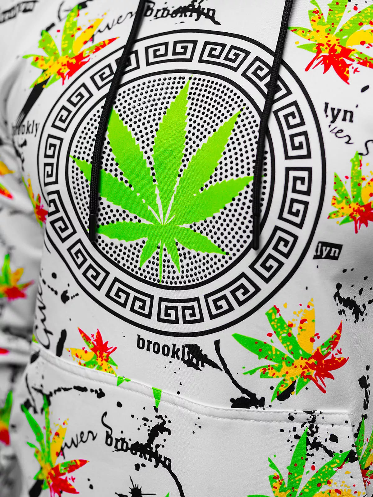 Vīriešu kapučjakas džemperis ar lielu ķengura kabatu. Modelis izceļas ar zaļu apdruku.