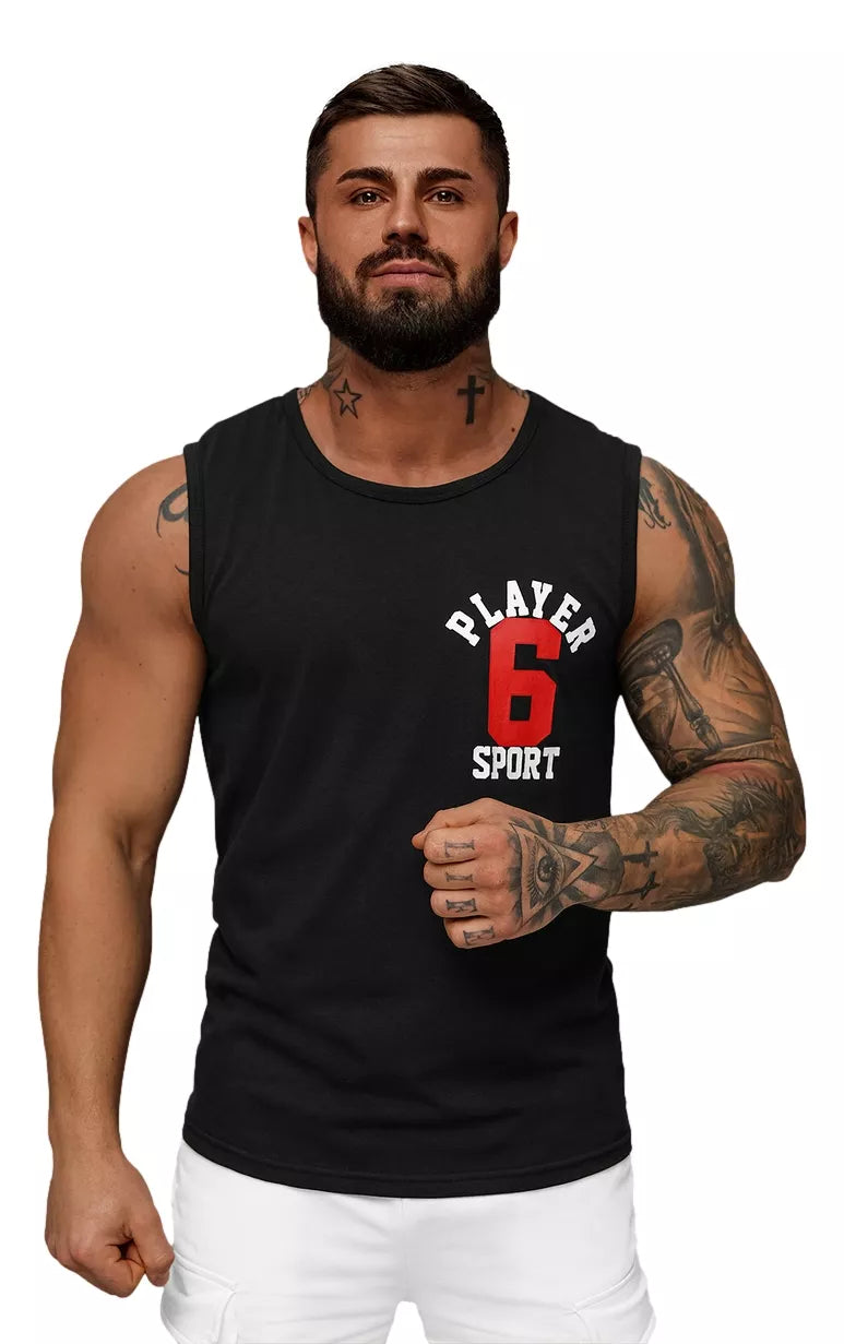Vīriešu sporta krekls bez piedurknēm "PLAYER 6 SPORT" Šis stilīgais vīriešu sporta krekls bez piedurknēm ir lieliski piemērots gan aktīviem sporta veidiem, gan atpūtai. Uzraksts "PLAYER 6 SPORT" priekšpusē piešķir tam izteiktu sportisku raksturu. Krekls bez piedurknēm ir izgatavots no viegla, elpojoša materiāla, kas nodrošina komfortu pat intensīvas kustības laikā. Lieliska izvēle treniņiem, skriešanai vai ikdienas valkāšanai.