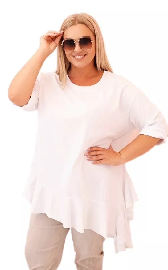 Lielo izmēru stils – ikdienišķs un sievišķīgsMīksta, elastīga kokvilna ar elastānuDekoratīva volāna apakšdaļāAsimetrisks piegriezums piešķir vieglumuUzlocītas piedurknesUniversāls stils – piemērots dažādiem gadījumiem