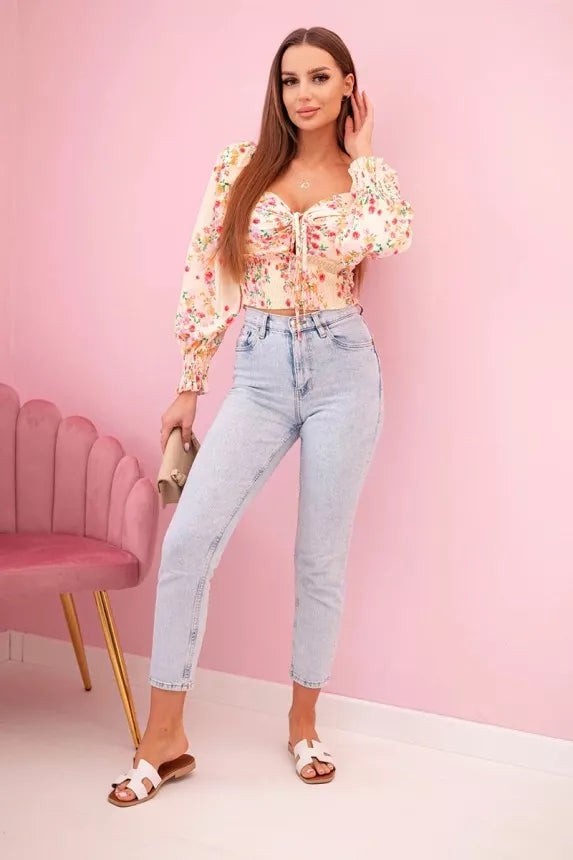 Meklējat blūzi, kas jūsu stilam piešķirs romantisku šarmu? Šī sieviešu spāņu stila blūze ir lieliska izvēle! Izgatavota no viegla, patīkama pieskārienam materiāla, tā skaisti izceļ siluetu un piešķir sievišķīgu šarmu. Modelim ir efektīva ieloce un mežģīnes uz krūtīm, kas nemanāmi atsedz kakla izgriezumu. Garas, uzpūstas piedurknes ar elastīgu apmali piešķir visam blūzes izskatam elegantu izskatu. Pateicoties ziedu rakstam, blūze ir ideāli piemērota daudziem gadījumiem - sākot no romantiskām vakariņām līdz ikdienas iziešanai. Izmērs ir universāls un derēs sievietēm, kas valkā S, M vai L izmērus.
