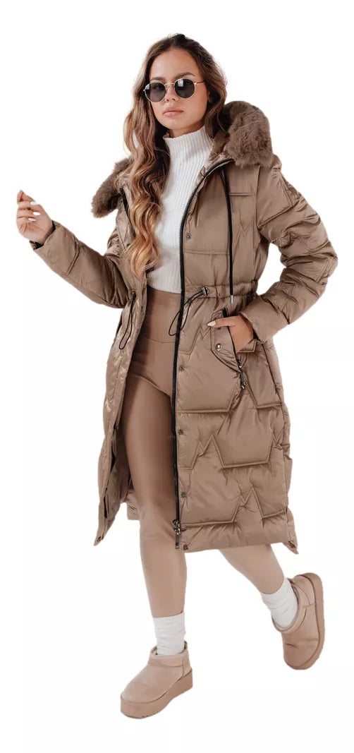 Šī praktiskā un sievišķīgā stepētā jaka ar kapuci un kažokādas apdari ir lieliska izvēle aukstām dienām. Tā sniedzas zem ceļgaliem, nodrošinot papildu aizsardzību pret aukstumu, un modernais piegriezums izceļ figūru, pateicoties regulējamai jostasvietai. Midi garums - efektīvi aizsargā pret aukstumu un vēju. Kažokāda uz kapuces - uzmanību piesaistoša detaļa, ko var noņemt. Regulējama kapuce - labāka piegulšana jebkuros laikapstākļos. Divas kabatas ar rāvējslēdzēju - droša un ērta vieta sīkiem priekšmetiem. Aukliņa jostasvietā - ļauj pielāgot jaku savai figūrai. Pateicoties izturīgajam polsterējumam un pārdomātajam piegriezumam, šī jaka ir ideāli piemērota ziemai. Tādas detaļas kā vīles, dubultais rāvējslēdzējs un ar kažokādu apdari apvilkta kapuce piešķir stilīgu akcentu. Lieliska izvēle gan ikdienas valkāšanai, gan garākām pastaigām aukstā laikā.