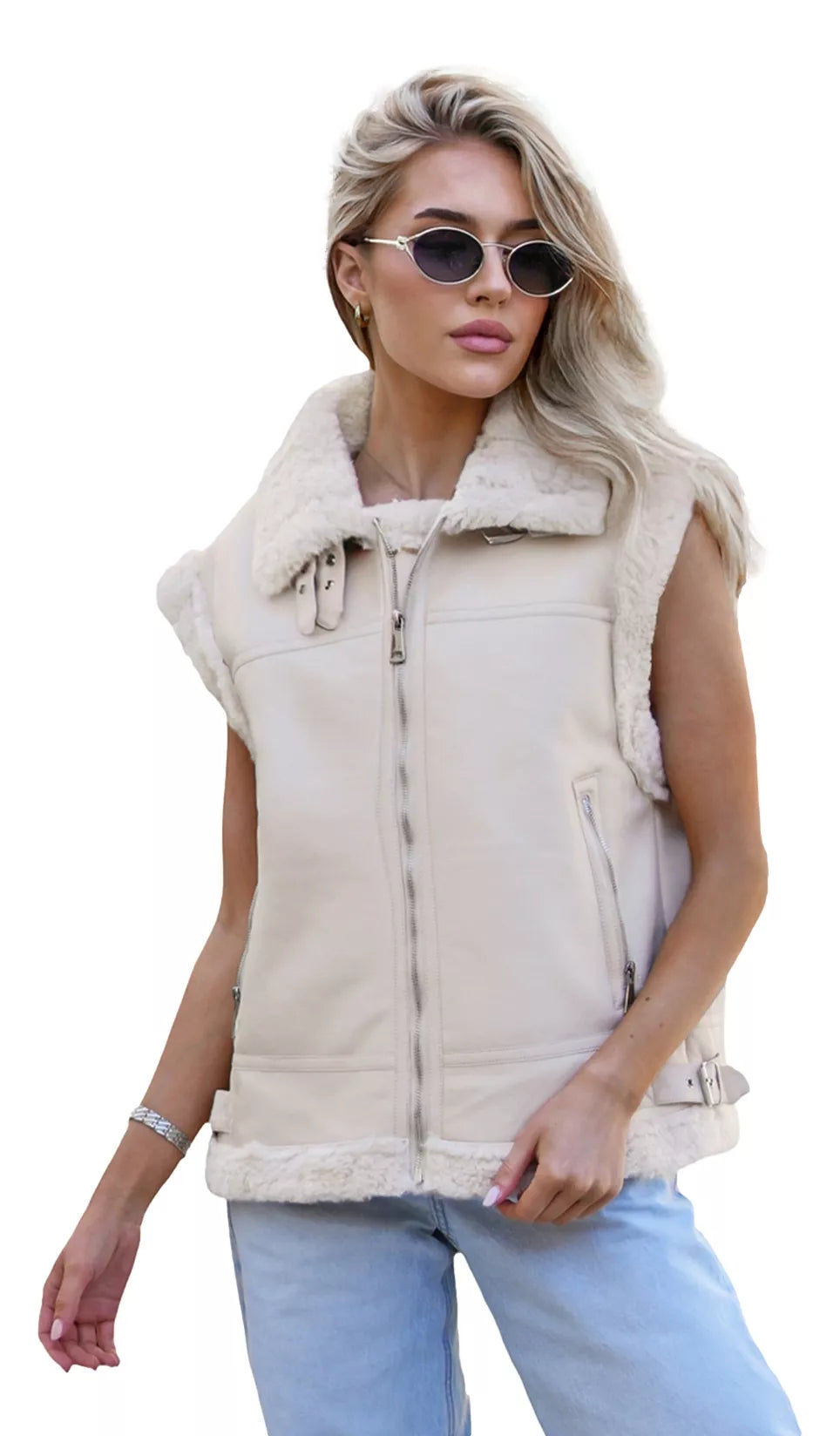 Stilīga sieviešu mākslīgās ādas veste ar siltu kažokādu. Šī veste ir dekorēta ar kontrastējošiem bēšiem kažokādas ieliktņiem, kas nodrošina siltumu un ekskluzīvu dizainu. Modelis aiztaisāms ar rāvējslēdzēju priekšpusē, sānos ir ērtas kabatas ar rāvējslēdzējiem. Apakšā un malās - regulējamas sprādzes detaļas, kas piešķir papildu raksturu un ekskluzivitāti. Veste ir ideāli piemērota rudens vai pavasara sezonai, to var kombinēt gan ar ikdienas apģērbu, gan ar elegantāku izskatu. Tā ir ne tikai stilīga, bet arī funkcionāla - tā nodrošina papildu siltuma slāni, neierobežo kustības un uzsver figūru. Šī veste kļūs par lielisku akcentu jūsu garderobē, kas labi piestāvēs gan ar svārkiem, gan biksēm vai džinsiem.