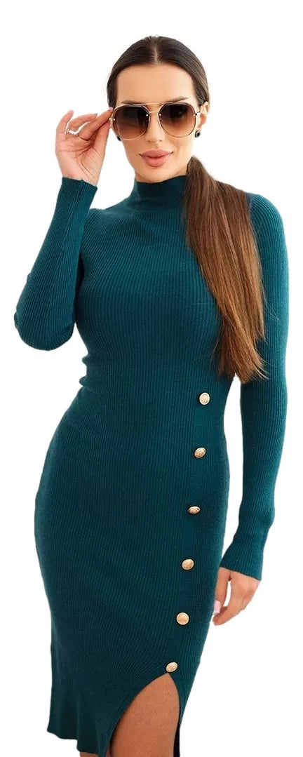 Šī elegantā sieviešu kleita ir lieliska izvēle vēsākām dienām! Izgatavota no elastīga, rievota auduma, tā skaisti pieguļ figūrai, izceļot sievišķīgās līknes. Kleitai ir moderna apkakle ar augstu apkakli, kas nodrošina komfortu un siltumu, un dekoratīvās zelta pogas sānos piešķir unikalitāti. Midi garums un smalks šķēlums apakšā padara šo kleitu stilīgu un ērtu. Lieliski piemērota ikdienas valkāšanai, darbam vai ballītei - vienkārši pievienojiet pareizos aksesuārus. Šī ir obligāta lieta jūsu rudens/ziemas garderobē! Izmērs ir universāls un der sievietēm ar izmēru S, M vai L. (Krūšu apkārtmērs no aptuveni 48 cm līdz 88 cm)