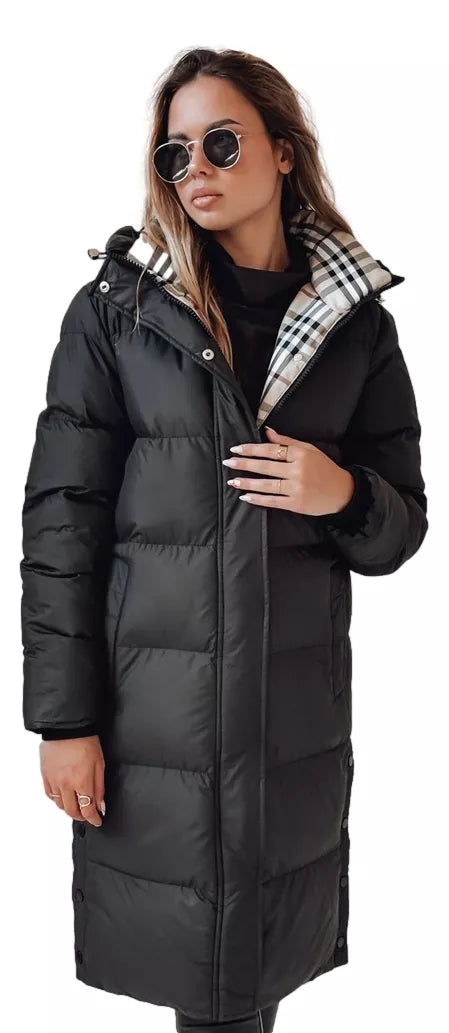 Šī garā dūnu jaka ar kapuci un dekoratīvu rūtainu oderi apvieno komfortu un eleganci. Silts polsterējums, izturīgas šuves un sānu rāvējslēdzēji nodrošina komfortu un kustību brīvību. Lieliska izvēle pilsētas ziemai. Sieviešu ziemas jaka ar rāvējslēdzēju un spiedpogām. Nenoņemama kapuce. Divas ārējās kabatas. Rievotas aproces.
