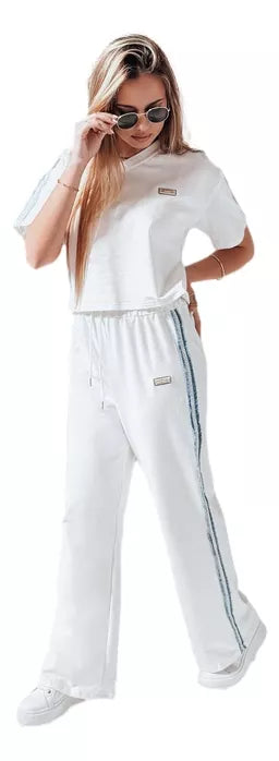 Šis sieviešu treniņtērpa komplekts, kas sastāv no īsa T-krekla un platām biksēm, ir lieliski piemērots pavasarim un siltākām dienām. Augšdaļai ir V veida kakla izgriezums, dekoratīvas 3D efekta svītras uz pleciem un neliela uzšuve uz krūtīm. Bikses ar augstu jostasvietu, elastīgu jostasvietu un aukliņu nodrošina pilnīgu komfortu. 3D svītras kāju sānos piešķir modernu akcentu. Šis komplekts ir lieliski piemērots pavasarim, atpūtai un ikdienas valkāšanai.