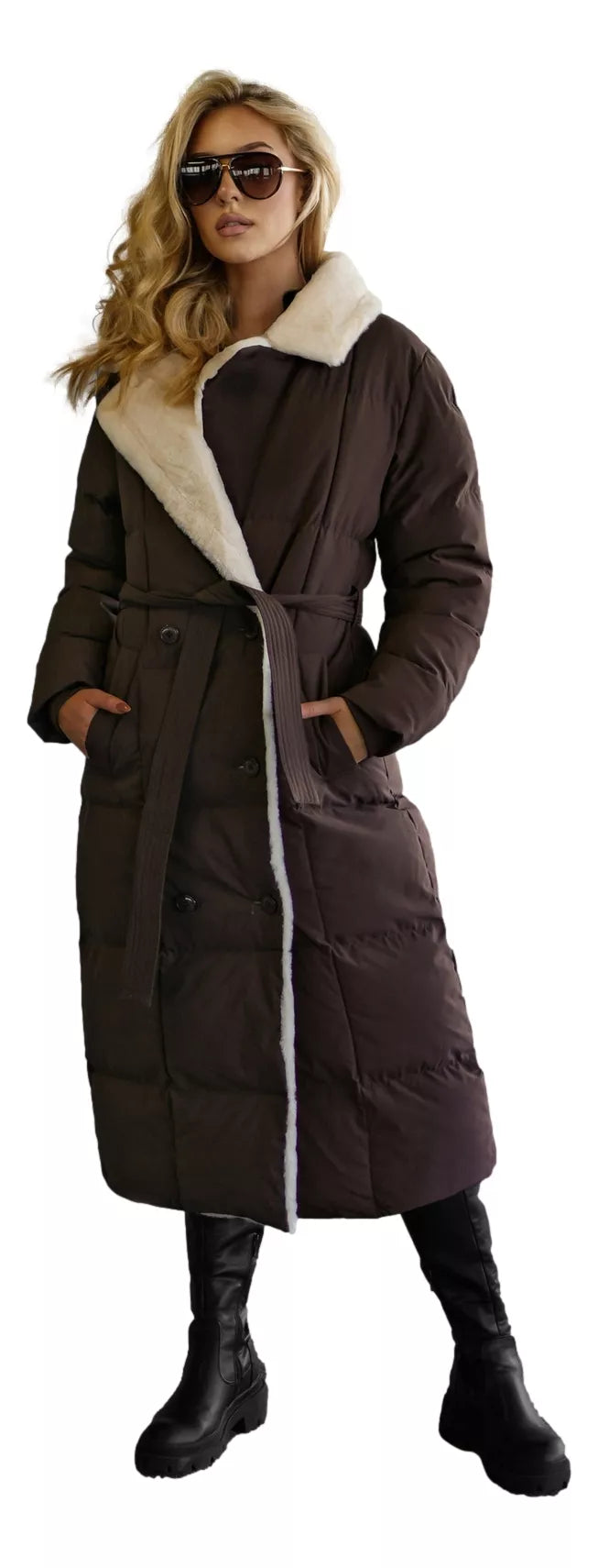 Elegants sieviešu garš ziemas mētelis šokolādes brūnā krāsā. Mētelis ir stepēts, nodrošinot siltumu un komfortu aukstajā sezonā. Garš modelis līdz ikriem, silts, pūkains stepēts audums. Kontrastējoša viegla mākslīgās kažokādas atloks un iekšējā apdare. Aizdare ar pogām un papildus sasienama ar jostu, uzsverot vidukli. Divas ērtas sānu kabatas