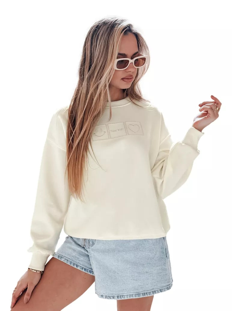 Sieviešu džemperis ar izšūtiem motīviem: smaidu, sirsniņu un uzrakstu "TAKE EASY". Ērts džemperis ar apaļu kakla izgriezumu un elastīgām aprocēm uz piedurknēm un apakšmalas. Viens izmērs der visiem no XS līdz L. Mīksts materiāls nodrošina komfortu ikdienas valkāšanai. Lieliska izvēle pavasara dienām, kad komforts un stils ir vissvarīgākais.