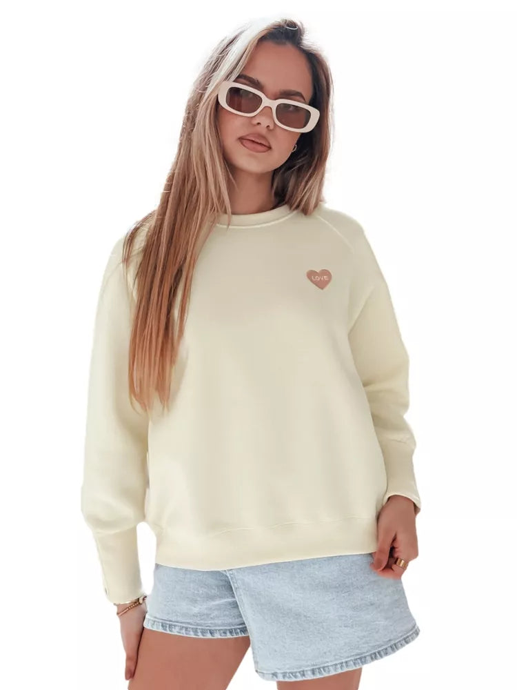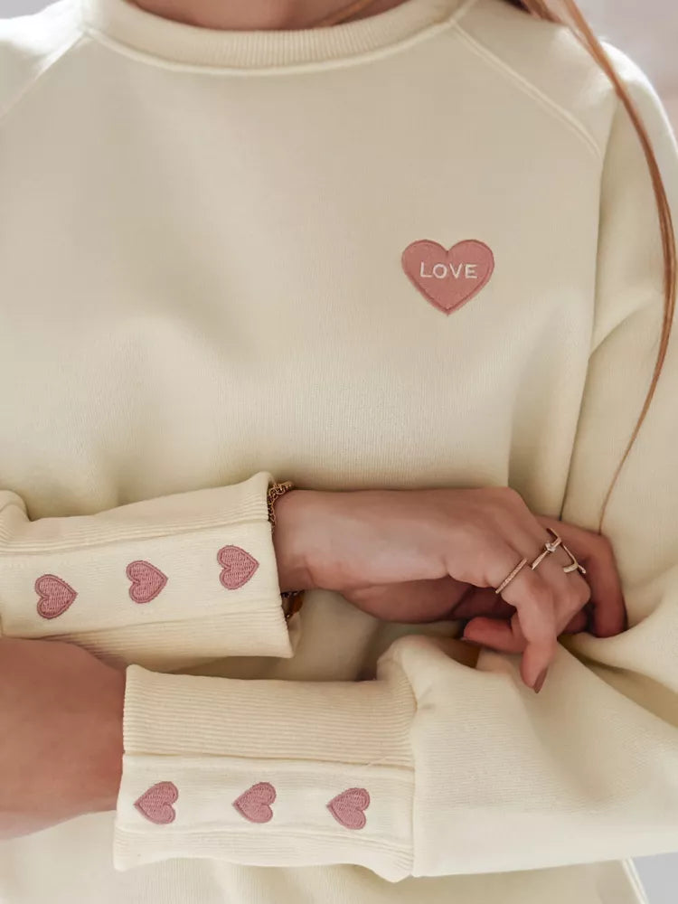 Sieviešu džemperis ar dekoratīvu sirsniņu izšuvumu un uzrakstu "LOVE" uz krūtīm un mīlīgām sirsniņām uz piedurknēm. Džempera modelis bez kapuces ar apaļu apkakli un elastīgām aprocēm. Universāls izmērs der no XS līdz L. Mīksts materiāls nodrošina valkāšanas komfortu. Lielisks pavasara stila piedāvājums.