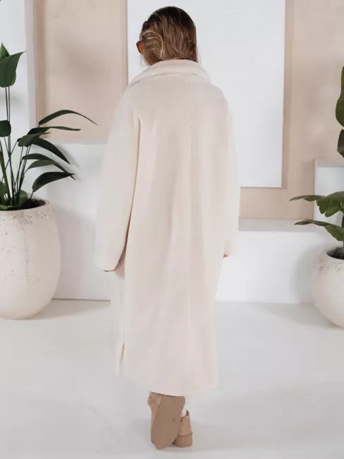 Sieviešu garš mētelis no mīkstas mākslīgās kažokādas, kas lieliski piemērots ziemas dienām. Klasiskā atlokamā apkakle un pogas priekšpusē piešķir tam eleganci, savukārt kabatas un sānu šķēlumi palielina komfortu. Mētelis ir oderēts komfortam un siltumam.