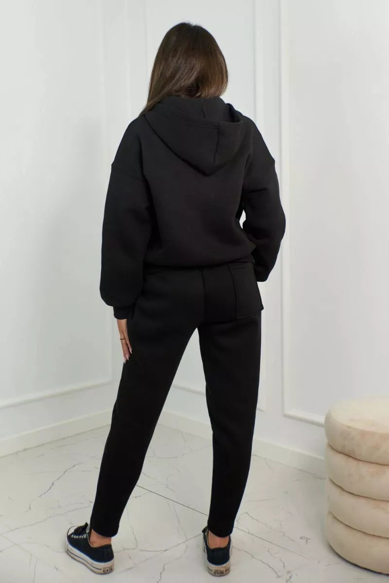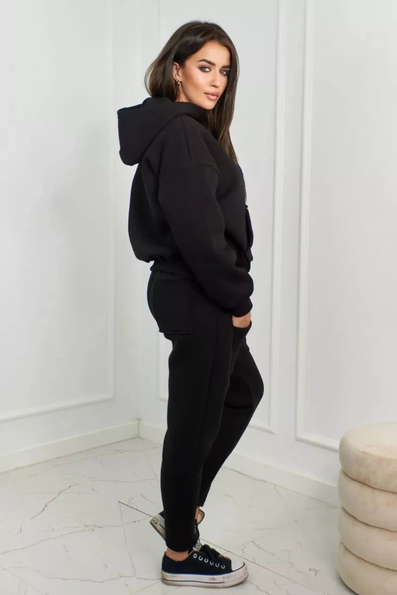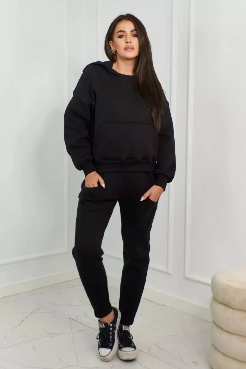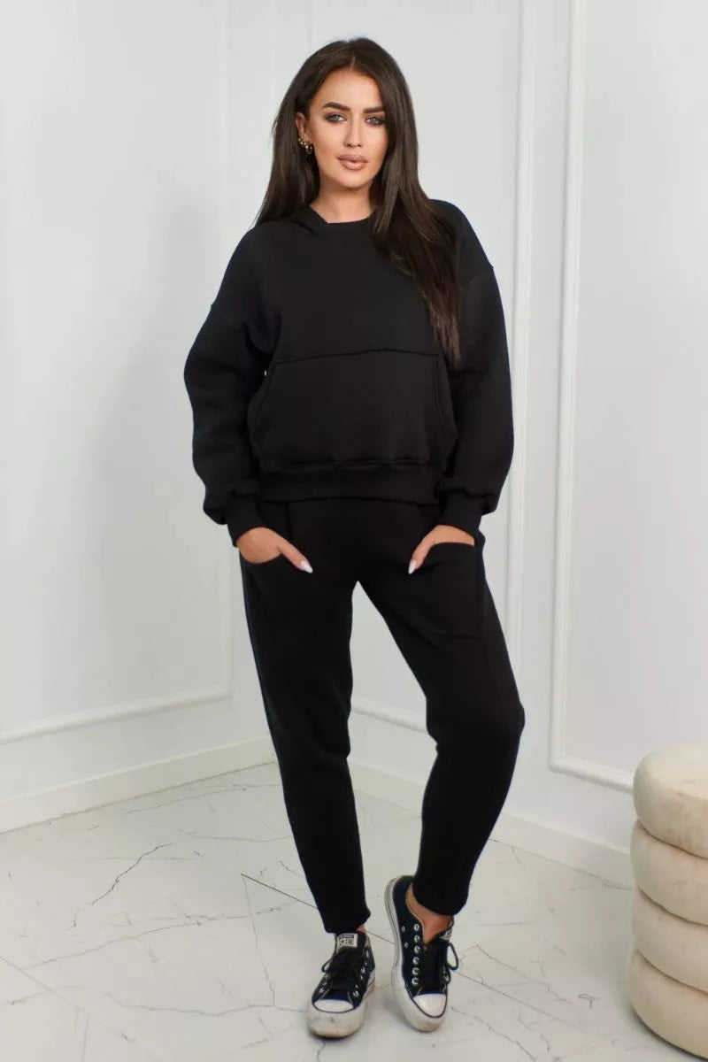 Komplekts, kas sastāv no džempera un biksēm ar kabatām, ir stila, komforta un funkcionalitātes apvienojums. Biksēm ir praktiskas sānu kabatas, kurās var ievietot sīkas lietas, piemēram, atslēgas vai telefonu. Elastīgā josta ar regulēšanas iespēju nodrošina komfortu un piegulšanu. Komplekts ir izgatavots no siltumizolējoša materiāla. Izmērs ir universāls un piemērots sievietēm, kas valkā S, M vai L izmēru.
