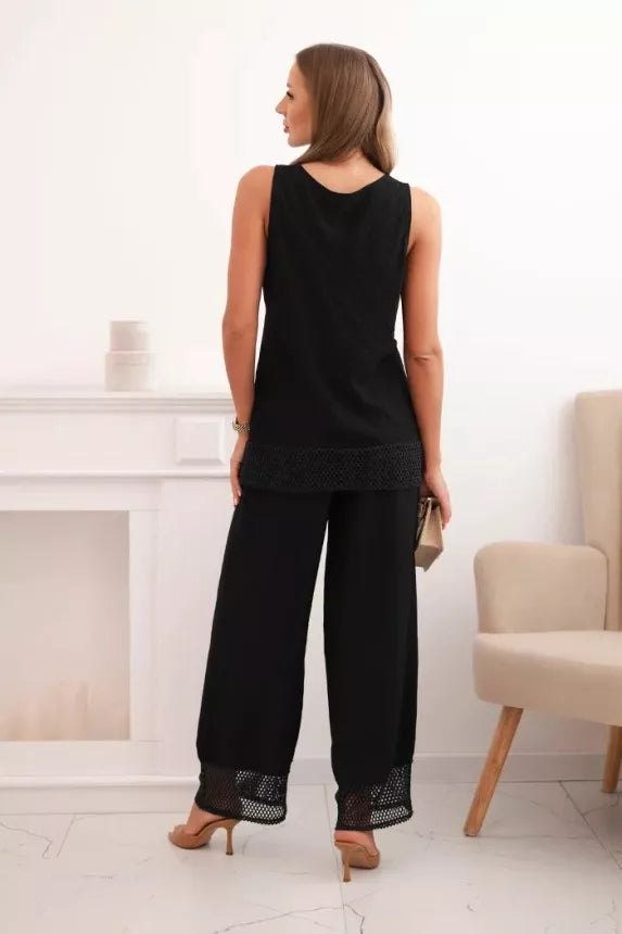 Šis sieviešu komplekts sastāv no vieglas blūzes ar platām lencītēm un ērtām, platām biksēm, kas ir ideāli piemērotas siltām dienām un atpūtai. Izgatavots no 100% viskozes, materiāls ir elpojošs, mīksts un patīkams pieskārienam, nodrošinot komfortu visas dienas garumā. Blūzei apakšdaļā ir smalks ažūra rotājums stilam, savukārt biksēm ir elastīga jostasvieta perfektai piegulšanai. Viens izmērs der visiem un derēs sievietēm S, M vai L izmērā. Ražots Itālijā.