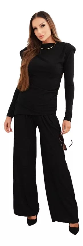 Šis sieviešu komplekts no kokvilnas blūzes un platām biksēm ir lieliska izvēle sievietēm, kas novērtē komfortu un modernu, minimālistisku stilu. Izgatavots no elastīga, rievota kokvilnas trikotāžas, tas lieliski pieguļ ķermenim un nodrošina komfortu visu dienu. Blūze ar garām piedurknēm un klasisku izgriezumu lieliski sader ar brīva piegriezuma biksēm ar platām kājām un elastīgu jostu. Tas ir lielisks komplekts gan brīvā laika pavadīšanai, gan ielas stilam. Izmērs ir universāls un piemērots S, M vai L izmēra sievietēm. (Krūšu apkārtmērs: aptuveni no 90 cm līdz 100 cm)