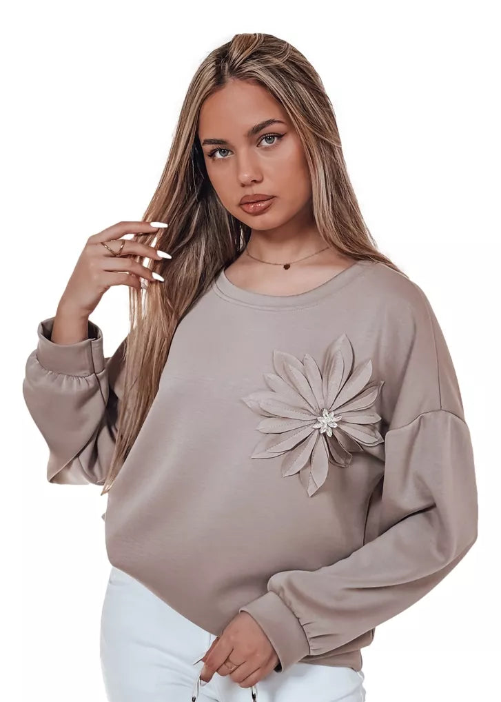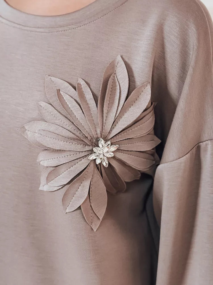 Sievišķīgs džemperis ar ziedu akcentu, kas apvieno komfortu ar romantisku stilu. Mīkstais materiāls nodrošina komfortu, savukārt izteiksmīgā ziedu formas aplikācija piešķir tam unikālu raksturu. Brīvais piegriezums labi sader ar džinsiem vai svārkiem, radot modernu un smalki elegantu stilu.