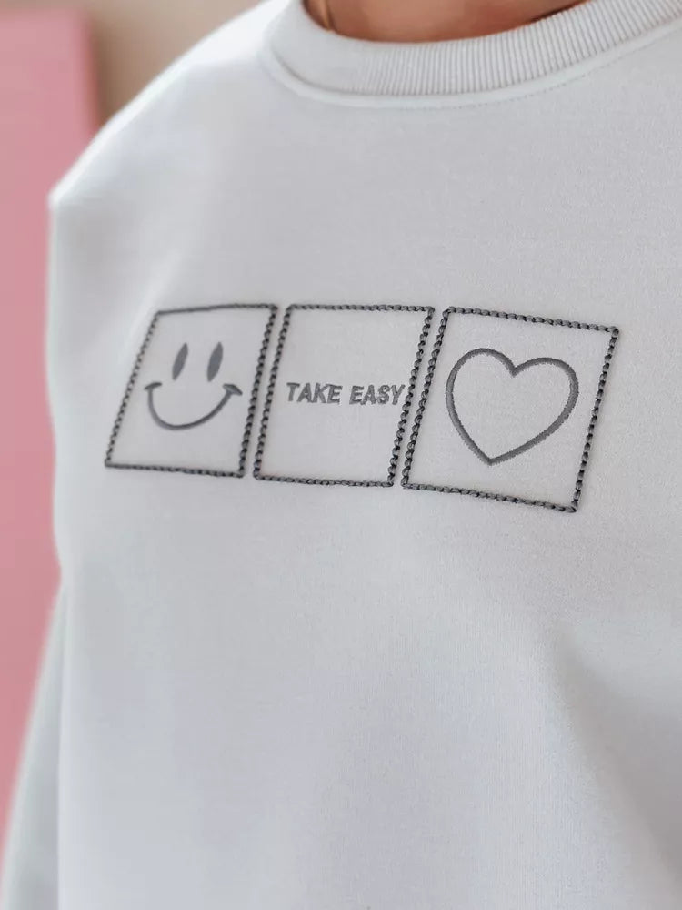 Sieviešu džemperis ar izšūtiem motīviem: smaidu, sirsniņu un uzrakstu "TAKE EASY". Ērts džemperis ar apaļu kakla izgriezumu un elastīgām aprocēm uz piedurknēm un apakšmalas. Viens izmērs der visiem no XS līdz L. Mīksts materiāls nodrošina komfortu ikdienas valkāšanai. Lieliska izvēle pavasara dienām, kad komforts un stils ir vissvarīgākais.
