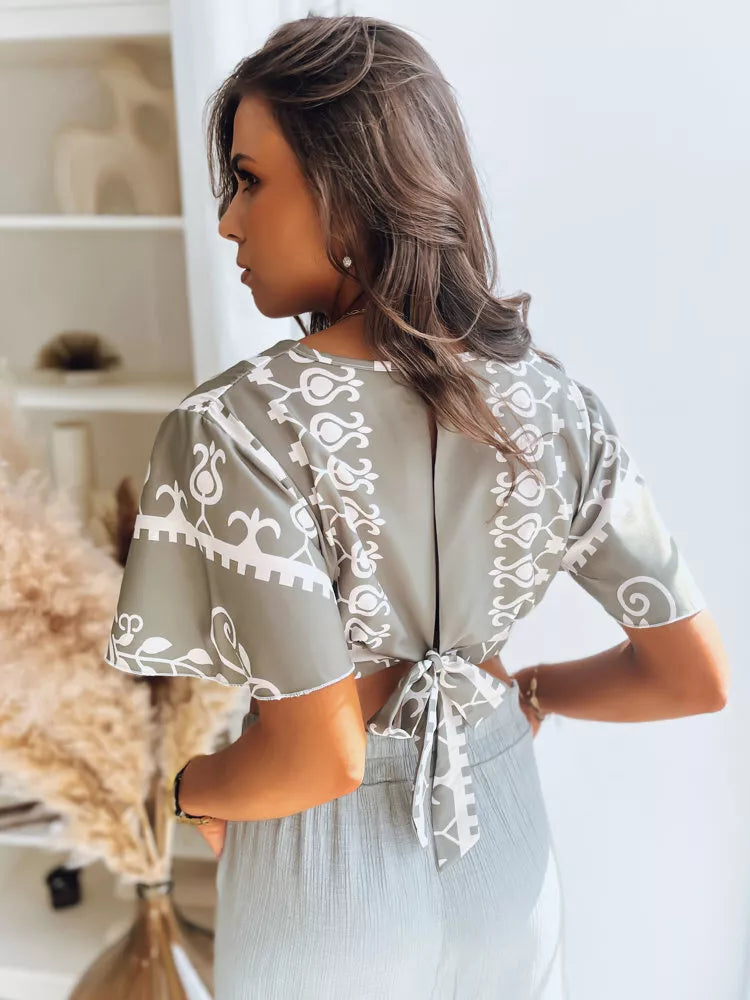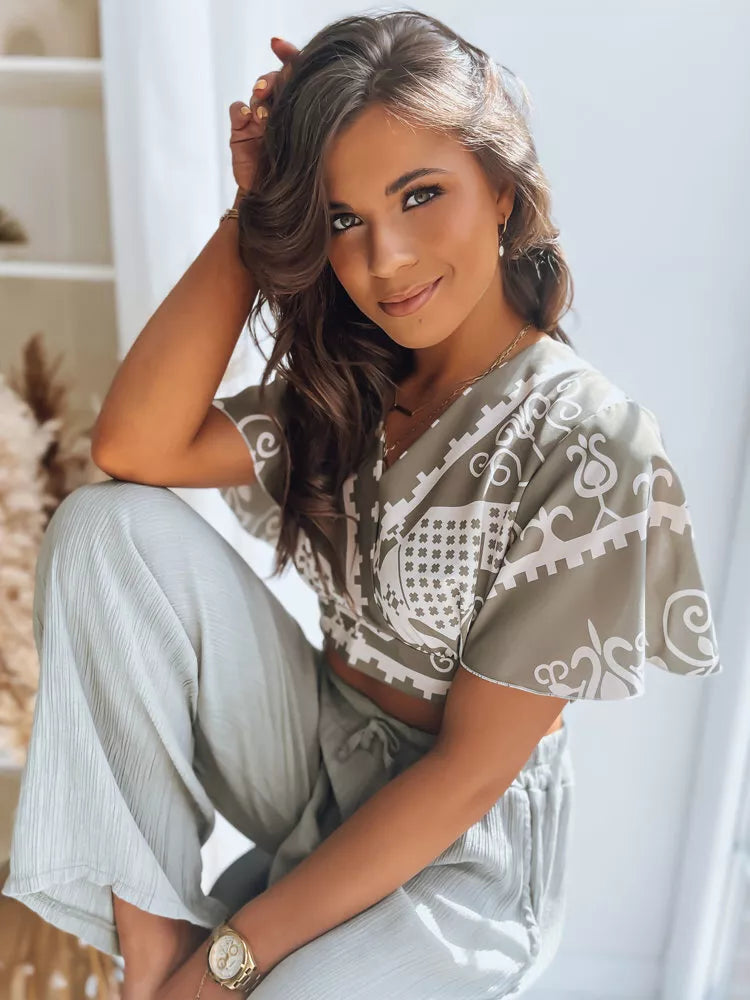 Īsais tops ir izgatavots no mīksta materiāla. Tam ir krokots V veida kakla izgriezums un brīvas piedurknes.