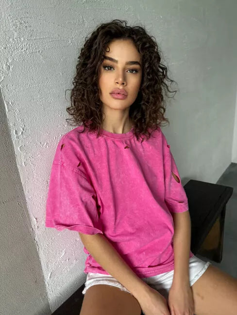 Klasisks dizains apvienojumā ar izteiksmīgiem šķēlumiem rada unikālu akcentu jūsu ikdienas garderobē. Apaļais kakla izgriezums izcels jūsu kaklu un piešķirs šarmu jebkuram stilam. Praktiski un raksturīgi AYUBAS T-krekli ir radīti, lai paustu jūsu individualitāti un pašapziņu. Lieliski piemēroti ikdienas pastaigām ar draugiem vai kā ikdienas pilsētvides tēla elements.