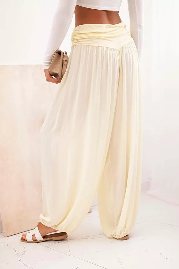 Šīs unikālās sieviešu platās bikses ar smalkām volāniem ir lieliski piemērotas ikdienas valkāšanai un ne tikai. Izgatavotas no 100% mīkstas viskozes, tās ir vieglas un ērtas valkāšanai pat siltākās dienās. Elastīgā jostasvieta nodrošina komfortu un lielisku piegulšanu, savukārt brīvais piegriezums ļauj brīvi kustēties un izskatās moderni. Elastīgās aproces bikšu apakšdaļā piešķir biksēm unikālu raksturu un nemanāmi izceļ figūru. Tās ir lieliska izvēle pastaigām, iepirkšanās braucieniem, ceļojumiem vai atpūtai mājās. Vienkāršais dizains un neitrālās krāsas ļauj tās viegli kombinēt ar dažādiem apģērba variantiem - sākot no sportiska līdz ikdienas. Viens izmērs der visiem, piemērots sievietēm S, M vai L izmērā.