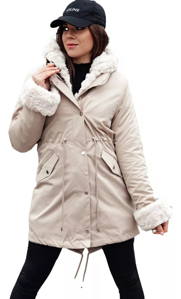 Gara sieviešu jaka ar kapuci un kažokādas apdari, kažokādas odere ir izņemama.