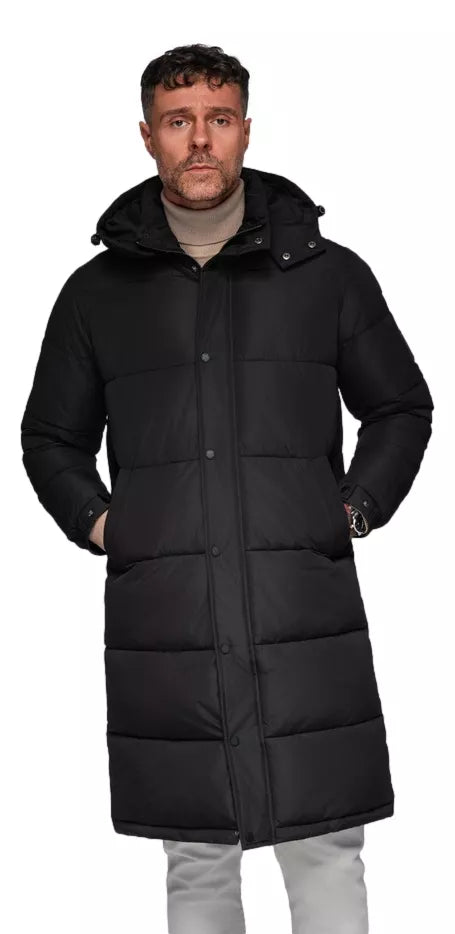 Vīriešu garā, melna ziemas dūnu jaka ar kapuci ir stilīga un praktiska izvēle aukstajai sezonai. Klasiskais taisna silueta modelis piešķir eleganci, un garākais piegriezums efektīvi aizsargā no aukstuma un vēja. Jakai ir horizontāli stepēti raksti, kas palīdz vienmērīgi sadalīt siltumu pa visu virsmu. Tā aiztaisāma ar rāvējslēdzēju un spiedpogām, nodrošinot papildu aizsardzību pret aukstumu. Kapuce ir regulējama ar aukliņām, un ietilpīgās kabatas sānos ļaus ērti turēt rokas vai nelielus priekšmetus. Šī jaka ir lieliski piemērota ikdienas valkāšanai, darbam vai atpūtai, un tā labi saderēs gan ar klasiskām, gan atpūtas apģērbu kombinācijām. Melnā krāsa nodrošina daudzpusību un ir viegli kombinējama ar dažādiem aksesuāriem.