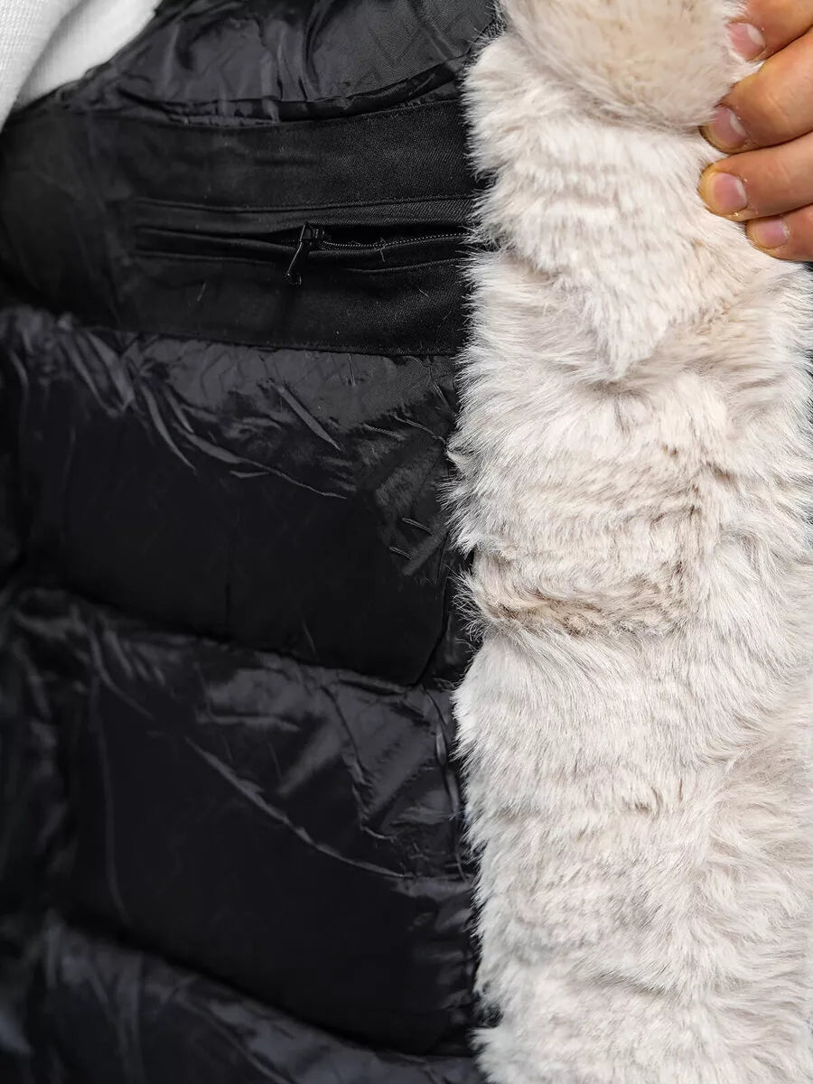 Vīriešu ziemas jaka ar rāvējslēdzēju, kapuci un kažokādu. Stilīgas detaļas uz piedurknēm un kabatām. Izmēru tabulu varat atrast fotoattēlos.