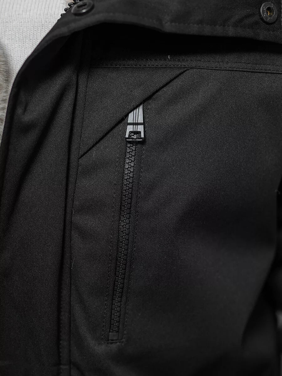 Vīriešu ziemas jaka ar kapuci un kažokādu. Rāvējslēdzēja aizdare ar kabatām.