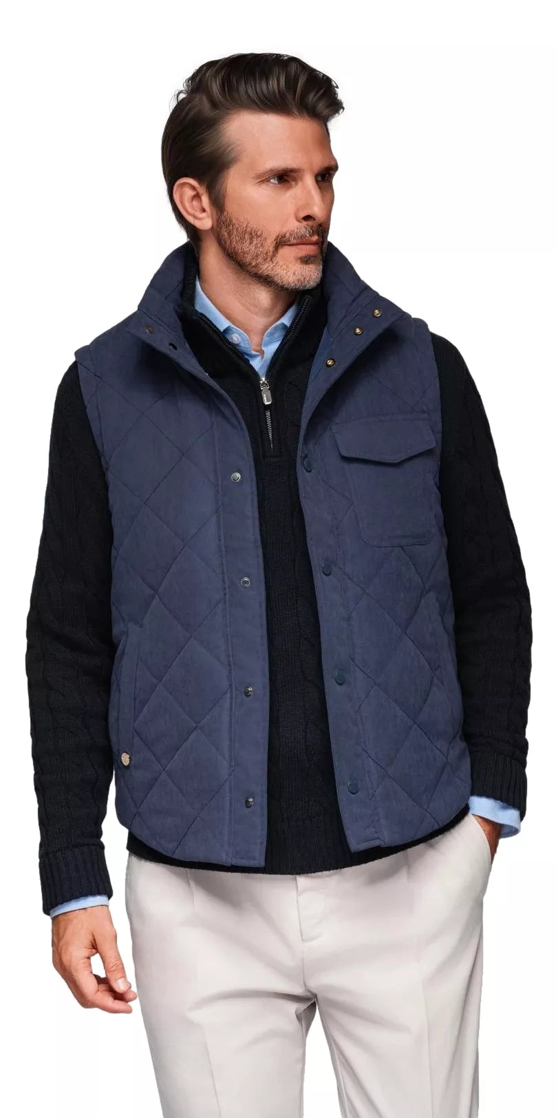 Veste ir ideāls klasiskā un modernā stila apvienojums. Pateicoties tās daudzpusīgajai formai un patīkamajam pieskārienam audumam, tā piestāvēs gan brīvajam, gan ikdienas tērpam. Stentētā struktūra, izsmalcinātās detaļas un neuzkrītošais zīmols piešķir tai izsmalcinātu izskatu. Tas ir viegls, bet praktisks apģērba gabals pārejas sezonai. Veste ir aiztaisāma ar spiedpogām, tai ir augsta apkakle un divas kabatas sānos, viena uz krūtīm. Materiāls: ārējais audums: 85% poliesters, 15% neilons odere: 100% poliesters Modeles augums: 185 cm. Modele valkā S/M izmēru.