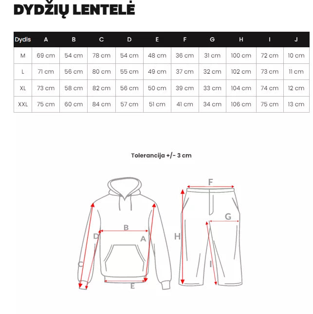 No jaunākās kolekcijas – vīriešu komplekts, kas sastāv no džempera ar kapuci un biksēm ar kabatām. Izmēru tabulu varat atrast produkta attēlos.