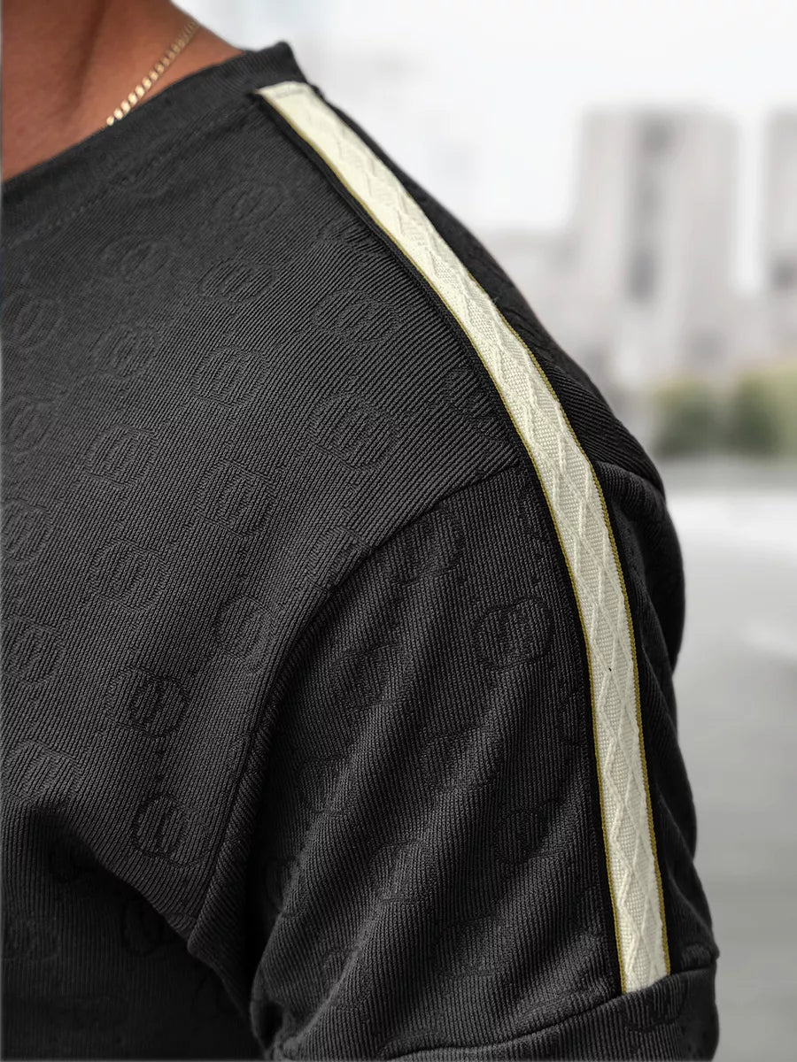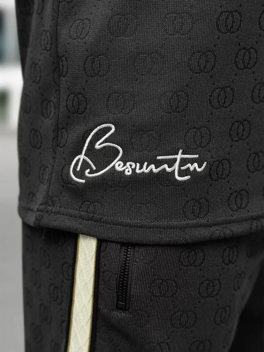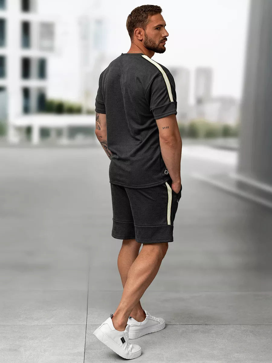 Stilīgs un ērts divdaļīgs komplekts vīriešiem – ideāls variants siltajai sezonai. Komplektu veido krekliņš ar īsām piedurknēm un šorti, kas izgatavoti no viegla, elpojoša auduma. Audums ir smalki dekorēts ar iespiestu rakstu, kas piešķir tam īpašu šarmu.