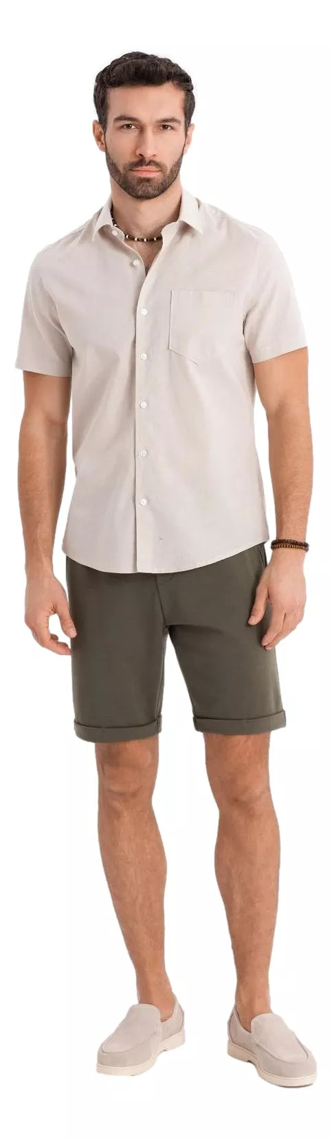 Vīriešu šorti lieliski piestāvēs jūsu ikdienas tērpam. Vienveidīgo krāsu un klasisko piegriezumu izceļ smalkas detaļas, kas piešķir šortiem unikālu raksturu. Viduklis ir regulējams ar aukliņām. Divas priekšējās chino kabatas,aizmugurējās kabatas imitējošas ieloces.